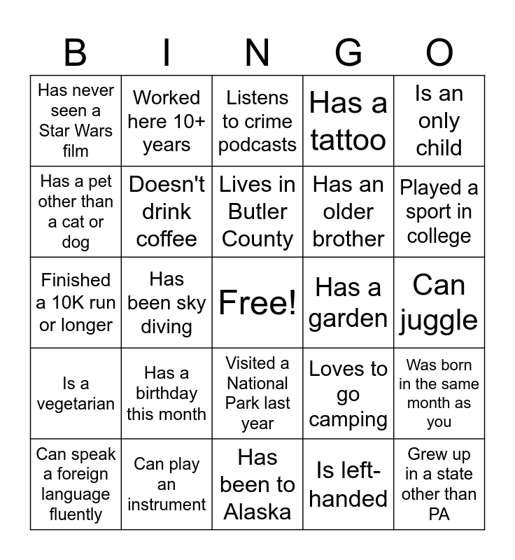 This bingo card has a free space and 24 words: Has a birthday this month, Can play an instrument, Lives in Butler County, Can speak a foreign language fluently, Is an only child, Has never seen a Star Wars film, Has a pet other than a cat or dog, Worked here 10+ years, Has a garden, Visited a National Park last year, Has an older brother, Finished a 10K run or longer, Loves to go camping, Was born in the same month as you, Doesn't drink coffee, Is left-handed, Can juggle, Listens to crime podcasts, Played a sport in college, Has been sky diving, Grew up in a state other than PA, Is a vegetarian, Has a tattoo and Has been to Alaska.