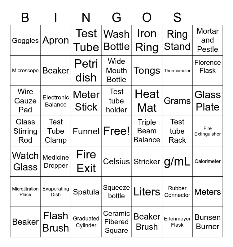 This bingo card has a free space and 54 words: Microtitration Place, Test Tube Clamp, Scoopula, Celsius, Iron Ring, Rubber Connector, Mortar and Pestle, Thin Stem Pipette, Apron, Spatula, Wash Bottle, Stricker, Test tube Rack, Glass Plate, Watch Glass, Medicine Dropper, Funnel, Wide Mouth Bottle, Beaker Brush, Grams, Florence Flask, Wire Gauze Pad, Electronic Balance, Test Tube, Gas port, Ring Stand, Calorimeter, Beaker, Evaporating Dish, Fire Exit, Test Tube Brush, Triple Beam Balance, Erlenmeyer Flask, Bunsen Burner, Goggles, Flash Brush, Meter Stick, Ceramic Fibered Square, Tongs, Thermometer, Meters, Glass Stirring Rod, Hot Hands Protector, Graduated Cylinder, Test tube holder, Liters, g/mL, Fire Extinguisher, Microscope, Beaker, Petri dish, Squeeze bottle, Heat Mat and Gloves.