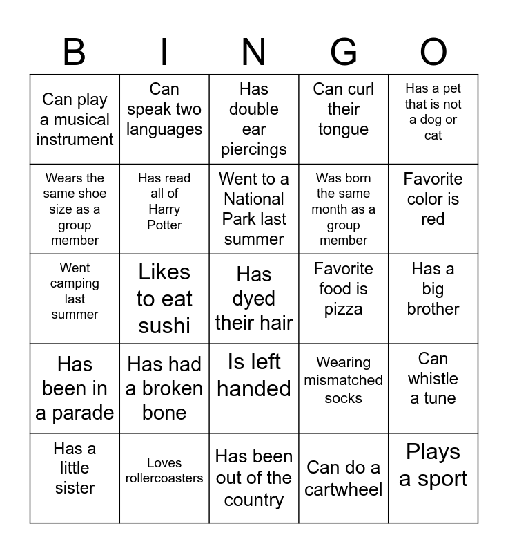 This bingo card has 25 words: Has had a broken bone, Has been out of the country, Went to a National Park last summer, Has a little sister, Has a pet that is not a dog or cat, Can play a musical instrument, Wears the same shoe size as a group member, Can speak two languages, Favorite food is pizza, Is left handed, Was born the same month as a group member, Went camping last summer, Wearing mismatched socks, Can whistle a tune, Has read all of Harry Potter, Plays a sport, Has a big brother, Has double ear piercings, Favorite color is red, Likes to eat sushi, Has dyed their hair, Loves rollercoasters, Has been in a parade, Can curl their tongue and Can do a cartwheel.