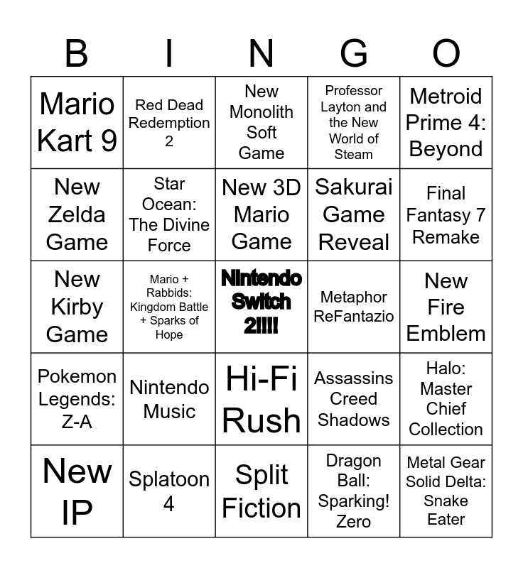 This bingo card has a free space and 24 words: Nintendo Music, Splatoon 4, New 3D Mario Game, New IP, Metroid Prime 4: Beyond, Mario Kart 9, New Zelda Game, Red Dead Redemption 2, Metaphor ReFantazio, Hi-Fi Rush, Sakurai Game Reveal, New Kirby Game, Assassins Creed Shadows, Halo: Master Chief Collection, Star Ocean: The Divine Force, Dragon Ball: Sparking! Zero, New Fire Emblem, New Monolith Soft Game, Final Fantasy 7 Remake, Mario + Rabbids: Kingdom Battle + Sparks of Hope, Metal Gear Solid Delta: Snake Eater, Pokemon Legends: Z-A, Professor Layton and the New World of Steam and Split Fiction.