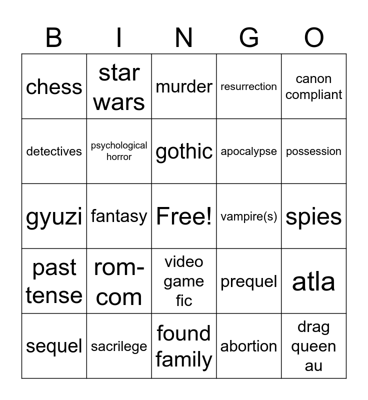 This bingo card has a free space and 24 words: rom-com, sacrilege, gothic, sequel, canon compliant, chess, detectives, star wars, vampire(s), video game fic, apocalypse, gyuzi, prequel, atla, psychological horror, abortion, spies, murder, possession, fantasy, drag queen au, past tense, resurrection and found family.