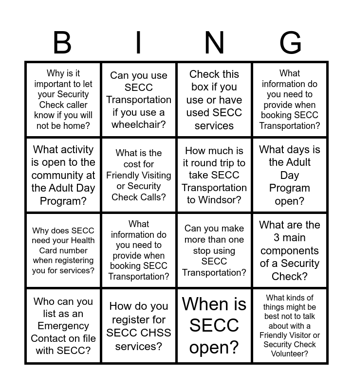 This bingo card has 47 words: Why is it important to let your Security Check caller know if you will not be home?, Who can you list as an Emergency Contact on file with SECC?, What information might be asked from you during an SECC CHSS intake?, Why does SECC need your Health Card number when registering you for services?, Free Square, Check this box if you use or have used SECC services, Can you use SECC Transportation if you use a wheelchair?, How often are you invoiced for SECC services?, What is the cost for Friendly Visiting or Security Check Calls?, What is SECC's phone number?, How much is it round trip to take SECC Transportation to Windsor?, What information do you need to provide when booking SECC Transportation?, What can you use SECC Transportation for?, What kinds of things might be best not to talk about with a Friendly Visitor or Security Check Volunteer?, What happens if a Security Check Volunteer is unable to reach you?, What are the 3 main components of a Security Check?, What days is the Adult Day Program open?, How do you register for SECC CHSS services?, Who can you list as an Emergency Contact on file with SECC?, What activity is open to the community at the Adult Day Program?, What are the 3 main components of a Security Check?, How many vehicles does SECC Transportation current operate?, Why is it important to let your Security Check caller know if you will not be home?, Why does SECC need your Health Card number when registering you for services?, What is the daily cost to attend SECC Adult Day Program?, What information do you need to provide when booking SECC Transportation?, What is SECC's phone number?, How much is it round trip to take SECC Transportation to Windsor?, How much notice is needed to cancel your SECC service?, What kinds of things might be best not to talk about with a Friendly Visitor or Security Check Volunteer?, How many vehicles does SECC Transportation current operate?, What happens if a Security Check Volunteer is unable to reach you?, Once registered with a SECC service, where can you direct your concerns, complaints or questions?, How is payment collected for rides with SECC Transportation?, How many minutes before pick up should you be ready for the SECC Transportation driver?, What can you use SECC Transportation for?, When is SECC open?, How much does it cost for an attendant to travel with you when using SECC Transportation?, Where are the three SECC offices located?, What is a rule of riding in SECC vehicles?, Who provides the meals for the Adult Day Program?, Check this box if you use or have used SECC services, Can you make more than one stop using SECC Transportation?, Free Square, Can you use SECC Transportation if you use a wheelchair?, How often are you invoiced for SECC services? and What is the cost for Friendly Visiting or Security Check Calls?.