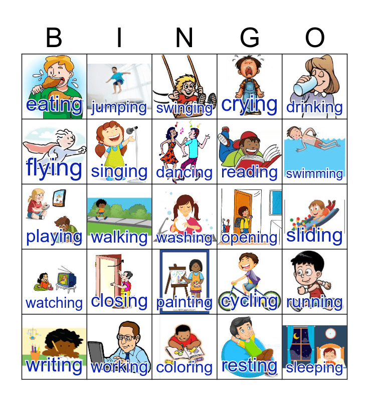 This bingo card has 25 images and 25 words: closing, coloring, dancing, writing, drinking, eating, flying, jumping, opening, painting, reading, playing, cycling, running, singing, sleeping, sliding, swinging, swimming, walking, washing, working, watching, crying and resting.