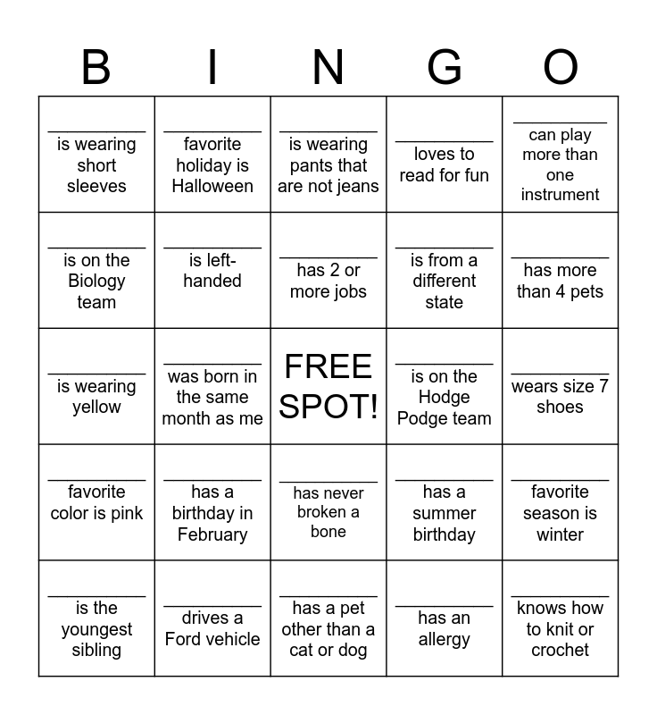 This bingo card has a free space and 29 words: __________ is the youngest sibling, ___________ has a name starting with the same letter as mine, __________ was born in the same month as me, __________ has more than 2 tattoos, __________ is wearing short sleeves, __________ is wearing pants that are not jeans, __________ is left-handed, __________ has a birthday in February, __________ is on the Hodge Podge team, __________ drives a Ford vehicle, __________ wears size 7 shoes, __________ knows how to knit or crochet, __________ has a pet other than a cat or dog, __________ has an allergy, __________ has more than 4 pets, __________ is on the Chemistry team, ___________ has never broken a bone, __________ favorite color is pink, __________ can play more than one instrument, __________ is wearing yellow, __________ has a summer birthday, __________ is the oldest sibling, __________ is from a different state, __________ is on the Biology team, __________ loves to read for fun, __________ favorite holiday is Halloween, __________ favorite season is winter, __________ has 2 or more jobs and __________ can speak two or more languages fluently.