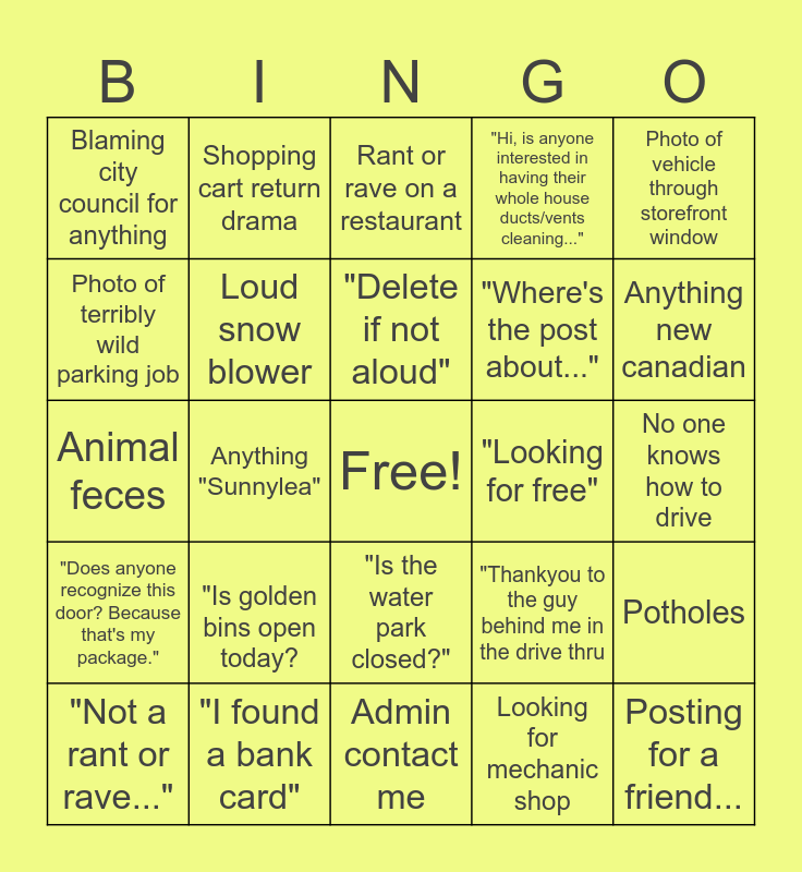 This bingo card has a free space and 24 words: "Is golden bins open today?, "I found a bank card", "Delete if not aloud", "Not a rant or rave...", Photo of vehicle through storefront window, Blaming city council for anything, Photo of terribly wild parking job, Shopping cart return drama, "Looking for free", "Is the water park closed?", "Where's the post about...", Animal feces, "Thankyou to the guy behind me in the drive thru, Potholes, Loud snow blower, Looking for mechanic shop, No one knows how to drive, Rant or rave on a restaurant, Anything new canadian, Anything "Sunnylea", Posting for a friend..., "Does anyone recognize this door? Because that's my package.", "Hi, is anyone interested in having their whole house ducts/vents cleaning..." and Admin contact me.