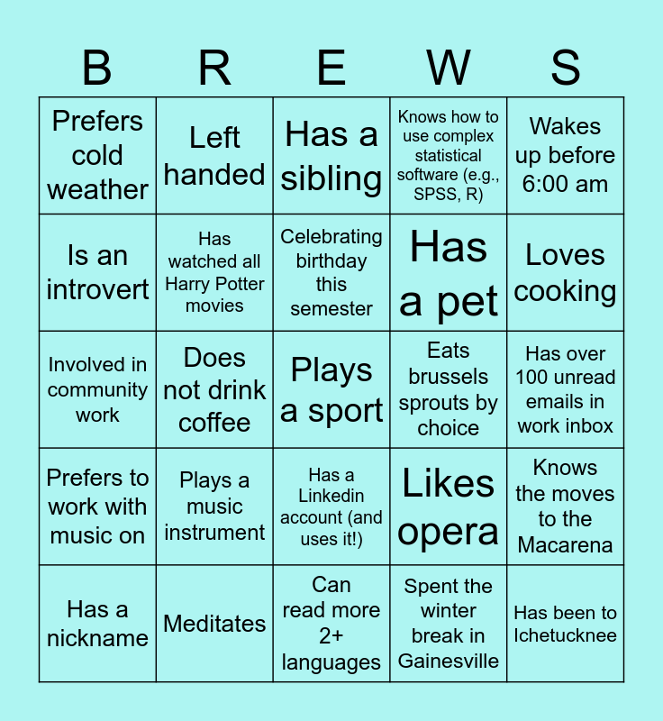 This bingo card has a free space and 24 words: Plays a music instrument, Meditates, Celebrating birthday this semester, Has a nickname, Wakes up before 6:00 am, Prefers cold weather, Is an introvert, Left handed, Eats brussels sprouts by choice, Has a Linkedin account (and uses it!), Has a pet, Involved in community work, Likes opera, Knows the moves to the Macarena, Has watched all Harry Potter movies, Spent the winter break in Gainesville, Has over 100 unread emails in work inbox, Has a sibling, Loves cooking, Does not drink coffee, Has been to Ichetucknee, Prefers to work with music on, Knows how to use complex statistical software (e.g., SPSS, R) and Can read more 2+ languages.