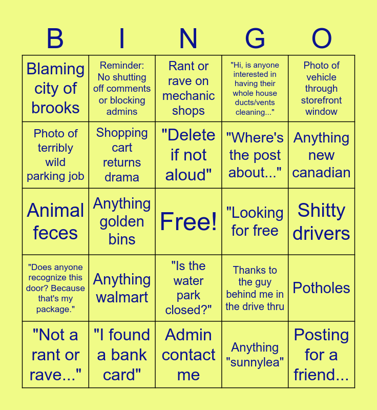 This bingo card has a free space and 24 words: Anything walmart, "I found a bank card", "Delete if not aloud", "Not a rant or rave...", Photo of vehicle through storefront window, Blaming city of brooks, Photo of terribly wild parking job, Reminder: No shutting off comments or blocking admins, "Looking for free, "Is the water park closed?", "Where's the post about...", Animal feces, Thanks to the guy behind me in the drive thru, Potholes, Shopping cart returns drama, Anything "sunnylea", Shitty drivers, Rant or rave on mechanic shops, Anything new canadian, Anything golden bins, Posting for a friend..., "Does anyone recognize this door? Because that's my package.", "Hi, is anyone interested in having their whole house ducts/vents cleaning..." and Admin contact me.