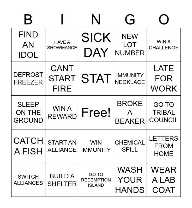 This bingo card has a free space and 39 words: SWIM IN OCEAN, MEDITECH DOWN, ANALYZER CRASHED, CANT START FIRE, SWITCH ALLIANCES, WIN IMMUNITY, STAT, REAGENTS EXPIRED, WIN A CHALLENGE, CATCH A FISH, WIN A REWARD, NEW LOT NUMBER, WEAR A LAB COAT, GO TO TRIBAL COUNCIL, BROKE A BEAKER, START AN ALLIANCE, WORK OT, FIND AN IDOL, HIDE AND LISTEN TO A CONVO, CHEMICAL SPILL, DEFROST FREEZER, GO TO REDEMPTION ISLAND, IMMUNITY NECKLACE, LATE FOR WORK, VACATION DAY, COOK RICE, JEFF STARTS AN ARGUMENT, GETTING WATER FROM WELL, QC FAIL, HAVE A SHOWMANCE, EAT BUGS, QUIT, SICK DAY, BUILD A SHELTER, WASH YOUR HANDS, WIN A CHALLENGE, LETTERS FROM HOME, SLEEP ON THE GROUND and LUNCH BREAK.