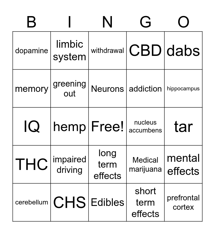 This bingo card has a free space and 24 words: impaired driving, CHS, Neurons, cerebellum, dabs, dopamine, memory, limbic system, nucleus accumbens, long term effects, addiction, IQ, Medical marijuana, mental effects, greening out, short term effects, tar, withdrawal, hippocampus, hemp, prefrontal cortex, THC, CBD and Edibles.