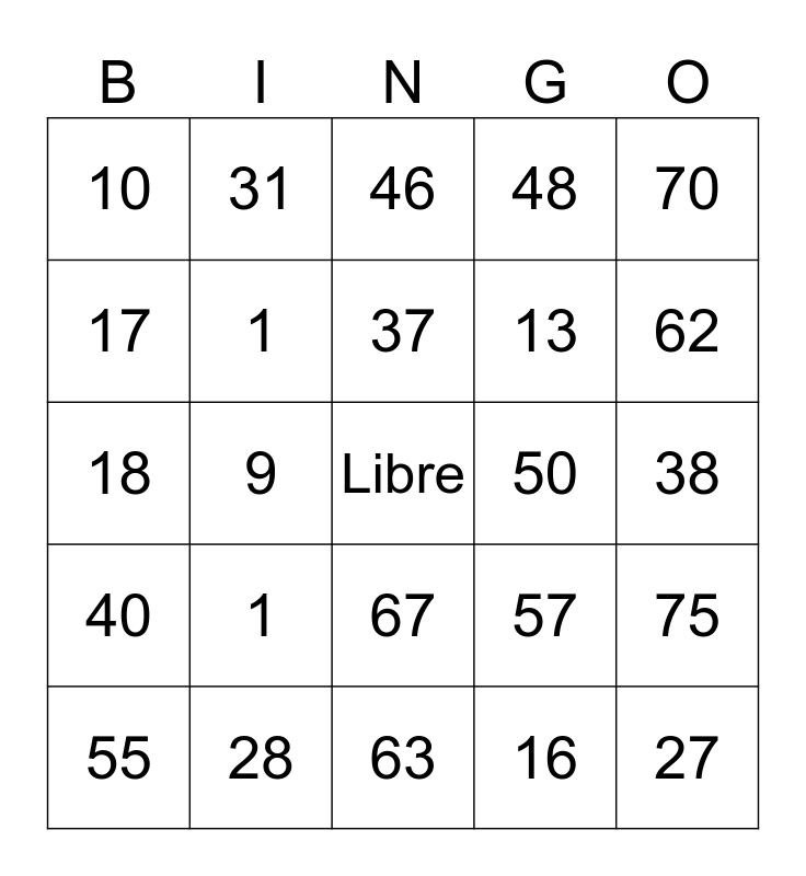 This bingo card has a free space and 24 words: 1, 28, 37, 55, 70, 10, 17, 31, 50, 67, 13, 18, 57, 75, 1, 16, 38, 46, 62, 9, 27, 40, 48 and 63.