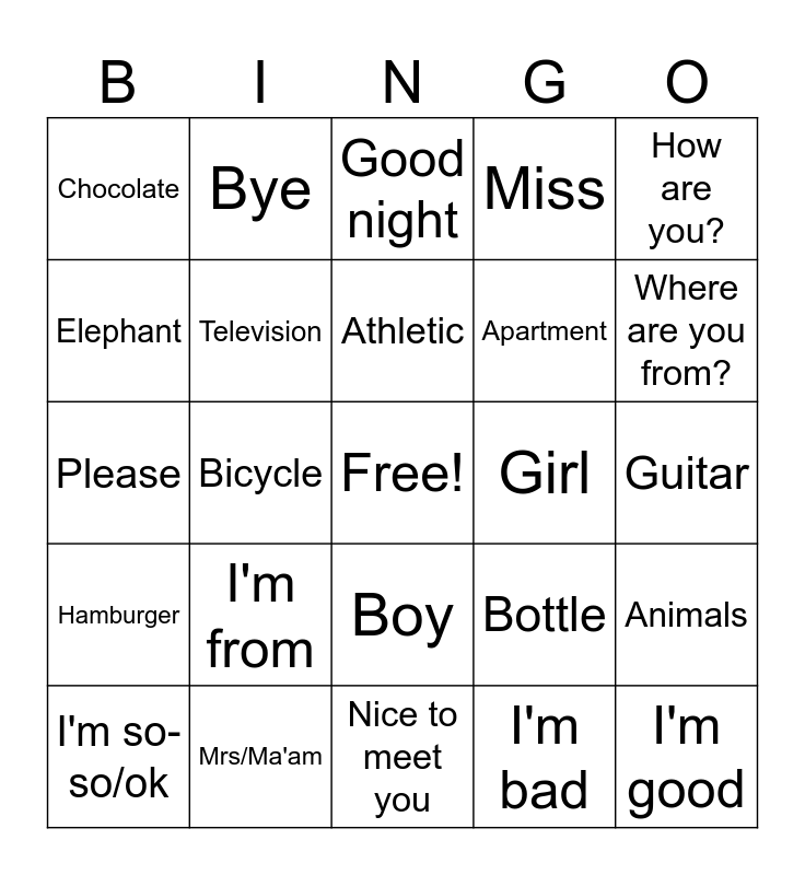 This bingo card has a free space and 44 words: Hello, I'm good, Good morning, I'm so-so/ok, Good afternoon, I'm bad, Good night, Mr/Sir, How are you?, Mrs/Ma'am, Miss, Girl, Boy, I'm from, What's your name?, Nice to meet you, My name is, Please, Thanks, Where are you from?, Bye, Yes, No, Chocolate, Fruit, Guitar, Lemonade, Honest, Bottle, Hamburger, Interestinng, Animals, Family, History, Bicycle, Concert, Ocean, Computer, Athletic, Elephant, Apartment, Mountain, Television and Mathematics.
