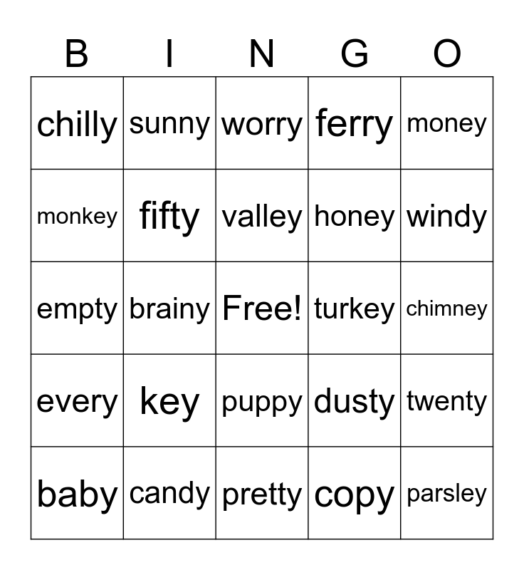 This bingo card has a free space and 24 words: key, candy, valley, baby, money, chilly, monkey, sunny, turkey, puppy, honey, empty, dusty, twenty, fifty, copy, chimney, worry, windy, brainy, parsley, every, ferry and pretty.