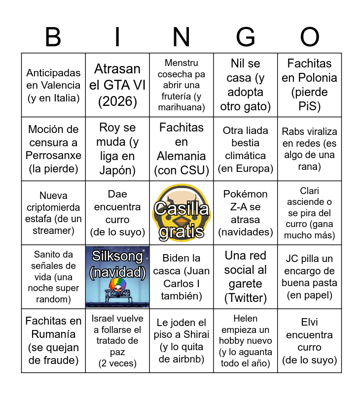 This bingo card has 1 images, a free space and 24 words: Silksong (navidad), Israel vuelve a follarse el tratado de paz (2 veces), Fachitas en Alemania (con CSU), Fachitas en Rumanía (se quejan de fraude), Fachitas en Polonia (pierde PiS), Anticipadas en Valencia (y en Italia), Moción de censura a Perrosanxe (la pierde), Atrasan el GTA VI (2026), Pokémon Z-A se atrasa (navidades), Biden la casca (Juan Carlos I también), Otra liada bestia climática (en Europa), Nueva criptomierda estafa (de un streamer), Una red social al garete (Twitter), JC pilla un encargo de buena pasta (en papel), Roy se muda (y liga en Japón), Helen empieza un hobby nuevo (y lo aguanta todo el año), Clari asciende o se pira del curro (gana mucho más), Menstru cosecha pa abrir una frutería (y marihuana), Rabs viraliza en redes (es algo de una rana), Dae encuentra curro (de lo suyo), Elvi encuentra curro (de lo suyo), Sanito da señales de vida (una noche super random), Nil se casa (y adopta otro gato) and Le joden el piso a Shirai (y lo quita de airbnb).