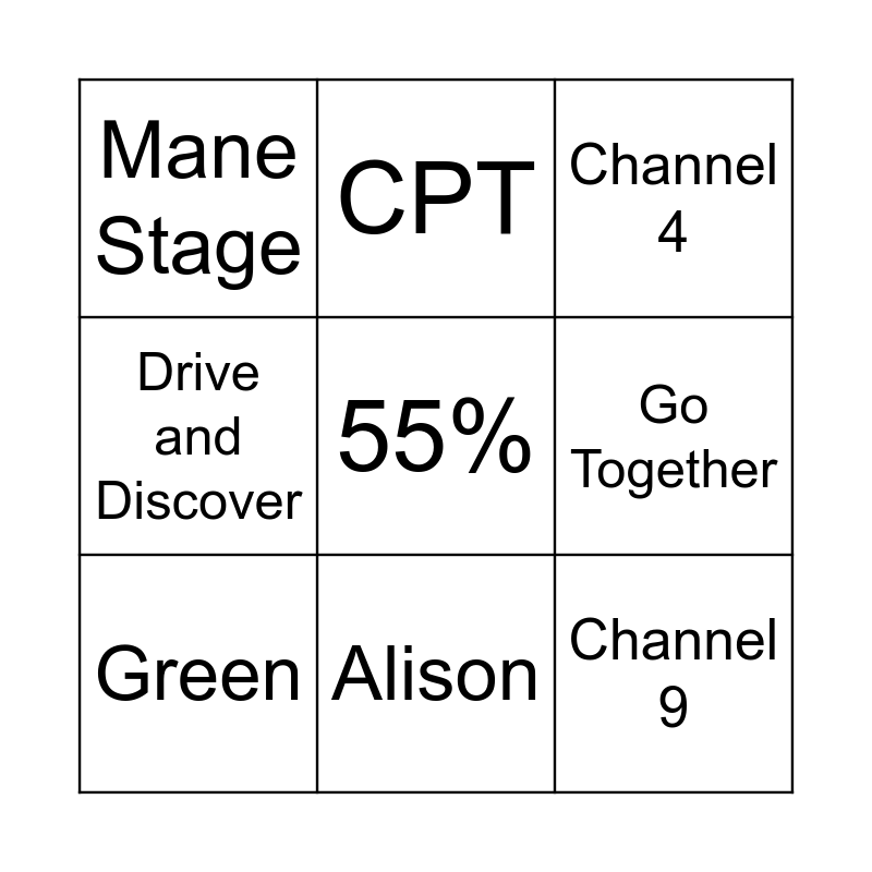 This bingo card has a free space and 21 words: We Care, Natasha, CPT, Lanyard, PeoplePortal, Green, Mane Stage, Channel 4, Jack, Alison, Cheyanne, Drive and Discover, Enjoy the Ride, Own your Craft, Go Together, 52%, COSHH Cabinet, Channel 2, Channel 9, PPE and Escaped Dangerous Animal.