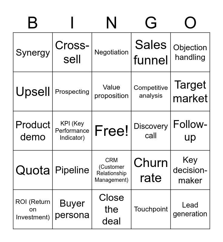 This bingo card has a free space and 25 words: Pipeline, Close the deal, Value proposition, ROI (Return on Investment), Objection handling, Synergy, Upsell, Cross-sell, Discovery call, CRM (Customer Relationship Management), Competitive analysis, Product demo, Churn rate, Key decision-maker, Prospecting, Revenue growth, Follow-up, Negotiation, Target market, KPI (Key Performance Indicator), Lead generation, Buyer persona, Quota, Sales funnel and Touchpoint.