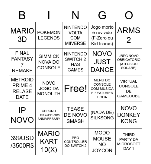 This bingo card has a free space and 24 words: CHRONO TRIGGER 30th ANNIVERSARY, MARIO KART 10(X), NINTENDO SWITCH 2 HAS GAMES, 399USD /3500R$, ARMS 2, MARIO 3D, FINAL FANTASY 7 REMAKE, POKEMON LEGENDS, MENU DO CONSOLE COM MUSICA E FEATURES FODA, TEASE DE NOVO SMASH, NOVO JUST DANCE, METROID PRIME 4 RELASE DATE, (NADA DE) SILKSONG, NOVO DONKEY KONG, GIMMICK NOVA DO CONSOLE, MODO MOUSE NO JOYCON, VIRTUAL CONSOLE DE GAMECUBE, NINTENDO VOLTA COM MIIVERSE, JRPG NOVO OBRIGATORIO (ATLUS OU SQUARE), NOVO JOGO DA MONOLITH, THIRD PARTY DA MICROSOFT DAY 1, IP NOVO, Jogo morto é revivido (F-Zero ou Kid Icarus) and PRO CONTROLLER DO SWITCH 2.