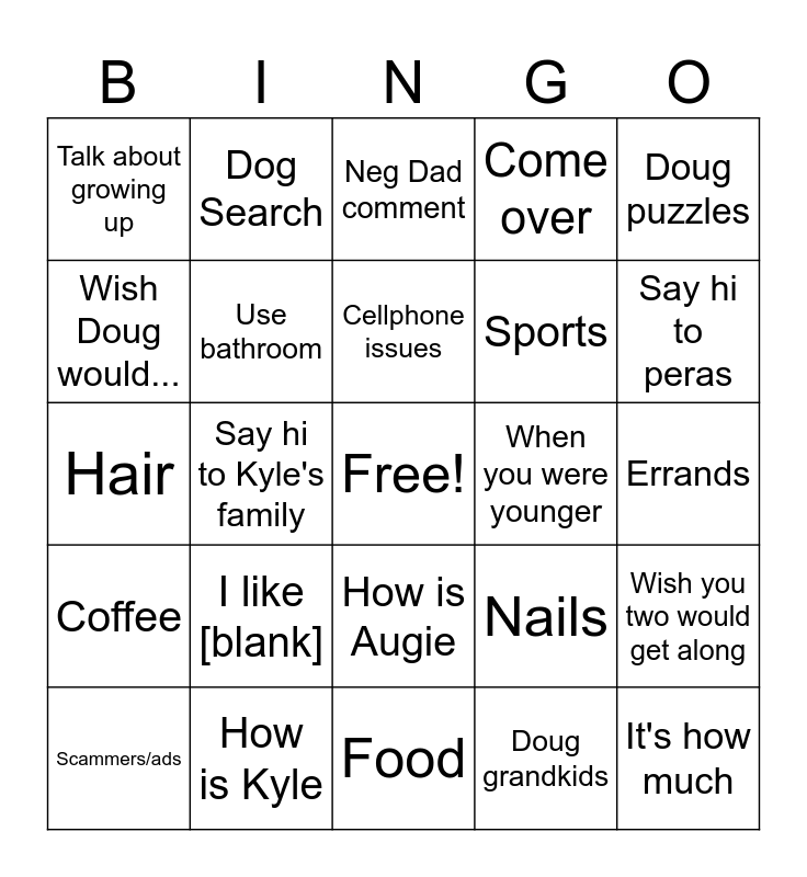 This bingo card has a free space and 24 words: I like [blank], How is Kyle, Cellphone issues, Scammers/ads, Doug puzzles, Talk about growing up, Wish Doug would..., Dog Search, When you were younger, How is Augie, Sports, Hair, Nails, Wish you two would get along, Use bathroom, Doug grandkids, Errands, Neg Dad comment, Say hi to peras, Say hi to Kyle's family, It's how much, Coffee, Come over and Food.