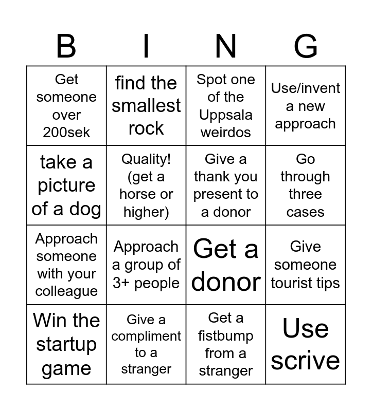 This bingo card has 16 words: Give a compliment to a stranger, Give someone tourist tips, Spot one of the Uppsala weirdos, Get someone over 200sek, Approach someone with your colleague, find the smallest rock, Get a donor, Get a fistbump from a stranger, take a picture of a dog, Quality! (get a horse or higher), Win the startup game, Use/invent a new approach, Approach a group of 3+ people, Go through three cases, Give a thank you present to a donor and Use scrive.