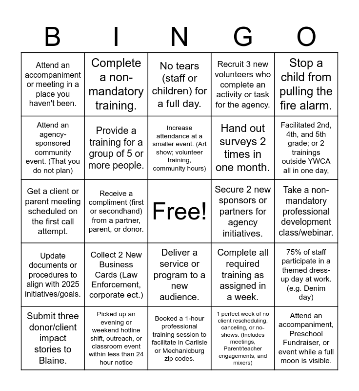 This bingo card has a free space and 24 words: Collect 2 New Business Cards (Law Enforcement, corporate ect.), Picked up an evening or weekend hotline shift, outreach, or classroom event within less than 24 hour notice, Increase attendance at a smaller event. (Art show; volunteer training, community hours), Submit three donor/client impact stories to Blaine., Stop a child from pulling the fire alarm., Attend an accompaniment or meeting in a place you haven't been., Attend an agency-sponsored community event. (That you do not plan), Complete a non-mandatory training., Secure 2 new sponsors or partners for agency initiatives., Deliver a service or program to a new audience., Hand out surveys 2 times in one month., Get a client or parent meeting scheduled on the first call attempt., Complete all required training as assigned in a week., 75% of staff participate in a themed dress-up day at work. (e.g. Denim day), Provide a training for a group of 5 or more people., 1 perfect week of no client rescheduling, canceling, or no-shows. (Includes meetings, Parent/teacher engagements, and mixers), Take a non-mandatory professional development class/webinar., No tears (staff or children) for a full day., Facilitated 2nd, 4th, and 5th grade; or 2 trainings outside YWCA all in one day,, Receive a compliment (first or secondhand) from a partner, parent, or donor., Attend an accompaniment, Preschool Fundraiser, or event while a full moon is visible., Update documents or procedures to align with 2025 initiatives/goals., Recruit 3 new volunteers who complete an activity or task for the agency. and Booked a 1-hour professional training session to facilitate in Carlisle or Mechanicburg zip codes..