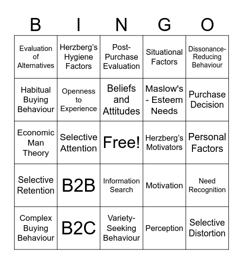 This bingo card has a free space and 24 words: B2B, B2C, Beliefs and Attitudes, Complex Buying Behaviour, Dissonance-Reducing Behaviour, Evaluation of Alternatives, Habitual Buying Behaviour, Herzberg’s Hygiene Factors, Herzberg’s Motivators, Information Search, Maslow's - Esteem Needs, Economic Man Theory, Motivation, Need Recognition, Openness to Experience, Perception, Personal Factors, Post-Purchase Evaluation, Purchase Decision, Selective Attention, Selective Distortion, Selective Retention, Situational Factors and Variety-Seeking Behaviour.