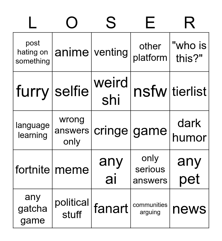 This bingo card has a free space and 24 words: meme, political stuff, weird shi, any gatcha game, "who is this?", post hating on something, furry, anime, game, any ai, nsfw, language learning, only serious answers, any pet, selfie, communities arguing, dark humor, venting, tierlist, wrong answers only, news, fortnite, other platform and fanart.