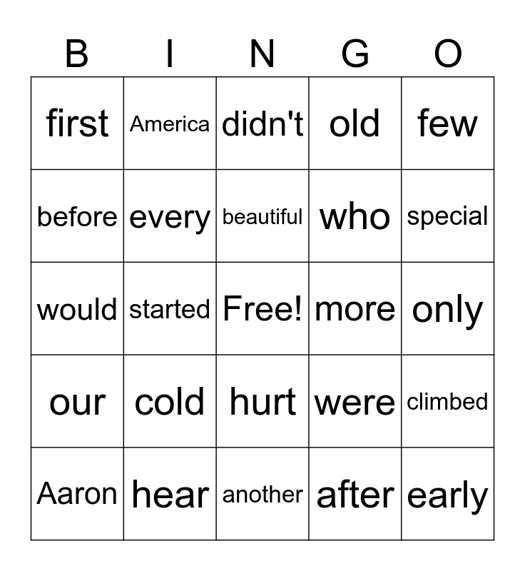 This bingo card has a free space and 37 words: sounds, group, long, more, only, our, started, three, who, won't, before, every, after, few, first, hear, hurt, old, special, would, America, beautiful, began, climbed, UCONN, country, didn't, give, often, year, your, another, were, early, Aaron, cold and says.