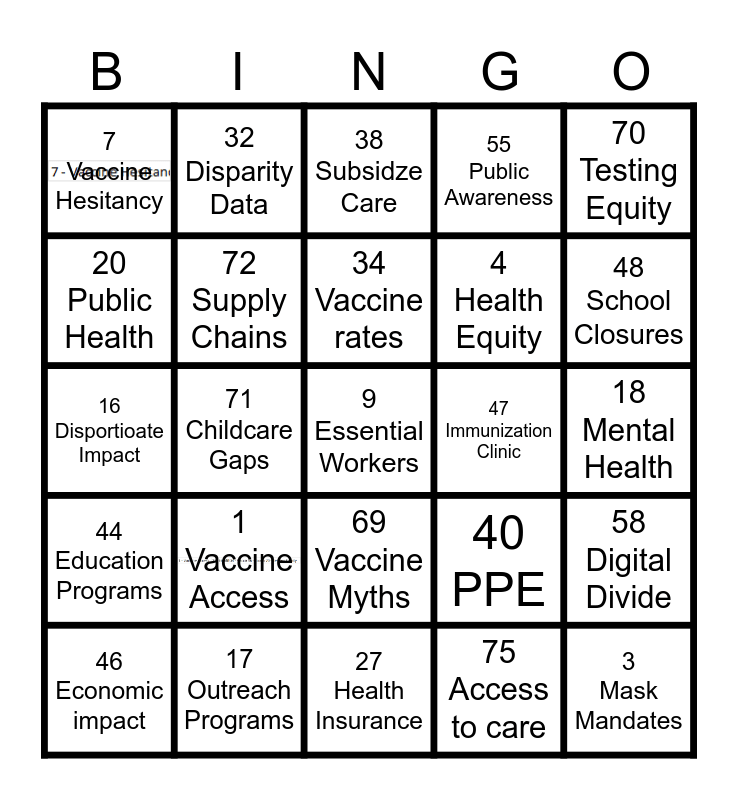 This bingo card has 2 images and 25 words: 1 Vaccine Access, 27 Health Insurance, 34 Vaccine rates, 46 Economic impact, 70 Testing Equity, 7 Vaccine Hesitancy, 20 Public Health, 32 Disparity Data, 47 Immunization Clinic, 69 Vaccine Myths, 4 Health Equity, 16 Disportioate Impact, 40 PPE, 58 Digital Divide, 72 Supply Chains, 3 Mask Mandates, 18 Mental Health, 38 Subsidze Care, 48 School Closures, 71 Childcare Gaps, 9 Essential Workers, 17 Outreach Programs, 44 Education Programs, 55 Public Awareness and 75 Access to care.