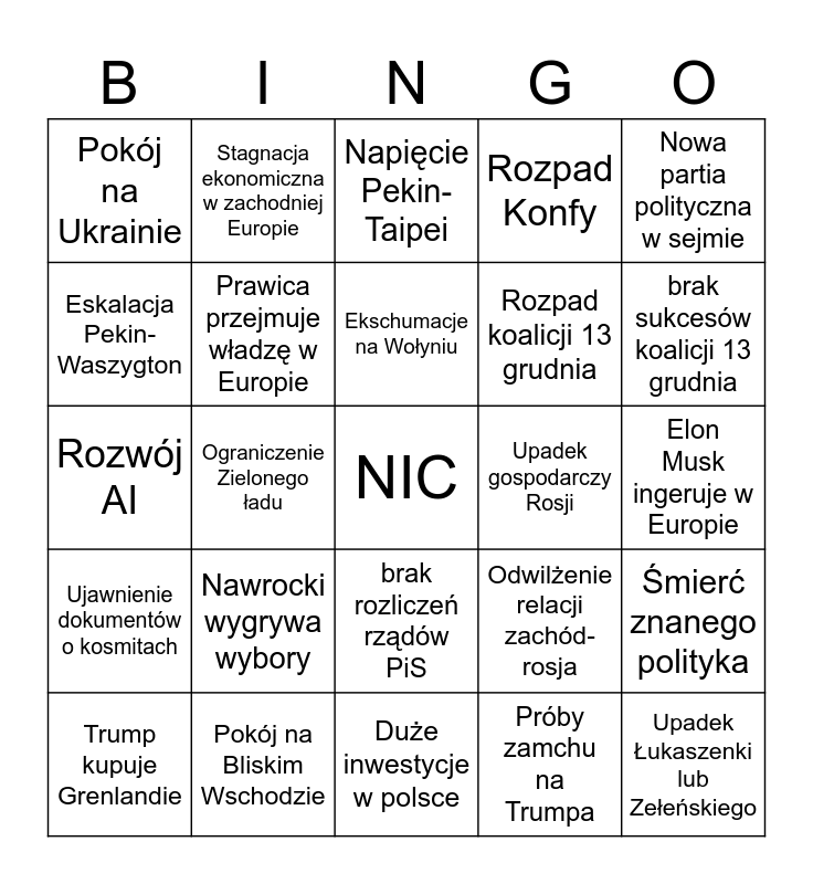 This bingo card has a free space and 24 words: Nawrocki wygrywa wybory, Pokój na Bliskim Wschodzie, Ekschumacje na Wołyniu, Trump kupuje Grenlandie, Nowa partia polityczna w sejmie, Pokój na Ukrainie, Eskalacja Pekin-Waszygton, Stagnacja ekonomiczna w zachodniej Europie, Upadek gospodarczy Rosji, brak rozliczeń rządów PiS, Rozpad koalicji 13 grudnia, Rozwój AI, Odwilżenie relacji zachód-rosja, Śmierć znanego polityka, Prawica przejmuje władzę w Europie, Próby zamchu na Trumpa, Elon Musk ingeruje w Europie, Napięcie Pekin-Taipei, brak sukcesów koalicji 13 grudnia, Ograniczenie Zielonego ładu, Upadek Łukaszenki lub Zełeńskiego, Ujawnienie dokumentów o kosmitach, Rozpad Konfy and Duże inwestycje w polsce.