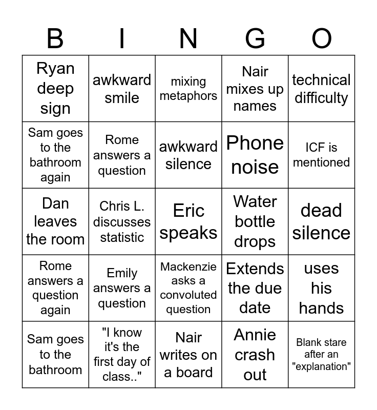 This bingo card has a free space and 29 words: Sam goes to the bathroom, Nair talks about his research, Chris L. discusses statistic, Sherwin imitation, Ryan deep sign, mixing metaphors, Rome answers a question, Emily answers a question, Water bottle drops, "I know it's the first day of class..", dead silence, Blank stare after an "explanation", Nair writes on a board, Annie crash out, ICF is mentioned, Someone mentions his bald spot, Mackenzie asks a convoluted question, Rome answers a question again, technical difficulty, Dan leaves the room, Extends the due date, Joe S. falls asleep, Phone noise, Sam goes to the bathroom again, Nair mixes up names, awkward smile, uses his hands, awkward silence and Ryan goes to the bathroom immediately after the break.