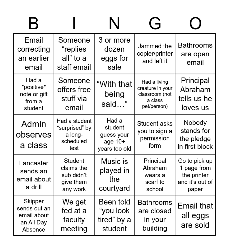 This bingo card has 34 words: Email that all eggs are sold, Bathrooms are closed in your building, Student asks to get water, Someone other than Moody-Byers does announcements, Lancaster sends an email about a drill, Someone offers free stuff via email, Bathrooms are open email, Skipper sends out an email about an All Day Absence, Someone “replies all” to a staff email, You attend a sporting event, “With that being said…”, 3 or more dozen eggs for sale, Testing Coordinator appreciates all we do, “Good Job, Good Job!”, Student asks you to sign a permission form, Principal Abraham tells us he loves us, We get fed at a faculty meeting, Admin observes a class, Student claims the sub didn’t give them any work, Principal Abraham wears a scarf to school, Music is played in the courtyard, Can you ID a kid from a photo?, Email correcting an earlier email, Nobody stands for the pledge in first block, Been told “you look tired” by a student, Had a student guess your age 10+ years too old, Jammed the copier/printer and left it, Fallen asleep before 8:00 p.m. after a school day, Had a living creature in your classroom (not a class pet/person), Had a *positive* note or gift from a student, Had classroom supplies go missing, Had a student “surprised” by a long-scheduled test, Go to pick up 1 page from the printer and it’s out of paper and “I was absent yesterday, did we do anything in class?”.