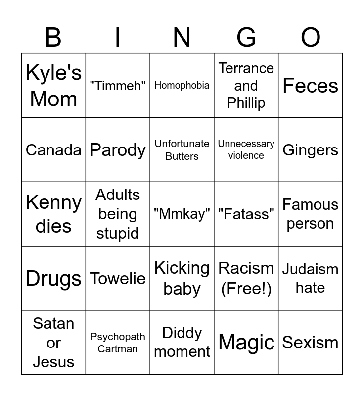 This bingo card has 25 words: Towelie, Diddy moment, Unfortunate Butters, Satan or Jesus, Feces, Kyle's Mom, Canada, "Timmeh", "Fatass", Kicking baby, Unnecessary violence, Kenny dies, Racism (Free!), Judaism hate, Parody, Sexism, Famous person, Homophobia, Gingers, Adults being stupid, "Mmkay", Psychopath Cartman, Drugs, Terrance and Phillip and Magic.