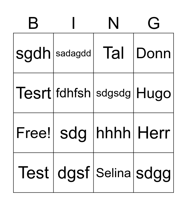 This bingo card has 20 words: Herr, Hirte, Tal, dsgsdg, Test, Tesrt, dgsf, sgdh, Free!, sadagdd, sdg, hhhh, fdhfsh, sdgg, sdgsdg, werwr, Hugo, Donn, Selina and Herb.