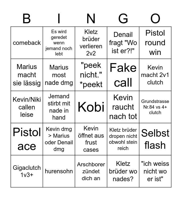 This bingo card has a free space and 24 words: Kevin dmg > Marius oder Denail dmg, hurensohn, "peek nicht." *peekt, Gigaclutch 1v3+, Pistol round win, comeback, Marius macht sie lässig, Es wird geredet wenn jemand noch lebt, Kevin raucht nach tot, Kevin öffnet aus frust cases, Fake call, Kevin/Niki callen leise, Kletz brüder dropen nicht obwohl stein reich, Selbst flash, Marius most nade dmg, Kletz brüder wo nades?, Grundstrasse Nr.84 vs 4+ clutch, Kletz brüder verlieren 2v2, Kevin macht 2v1 clutch, Jemand stirbt mit nade in hand, "ich weiss nicht wo er ist", Pistol ace, Denail fragt "Wo ist er?!" and Arschborer zündet dich an.