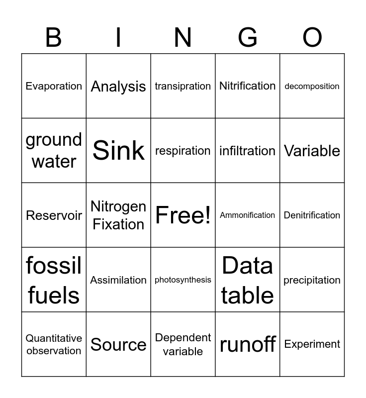 This bingo card has 40 words: Biogeochemical Cycle, Reservoir, Flux, Sink, Source, photosynthesis, respiration, combustion, decomposition, fossil fuels, Nitrogen Fixation, Nitrification, Free!, Denitrification, Ammonification, Assimilation, Legumes, Evaporation, condensation, transipration, precipitation, runoff, infiltration, ground water, Greenhouse gases, Scientific method, Hypothesis, Question, Experiment, Observation, Qualitative observation, Quantitative observation, Data, Data table, Variable, Dependent variable, Independent variable, Inference, Analysis and Conclusion.