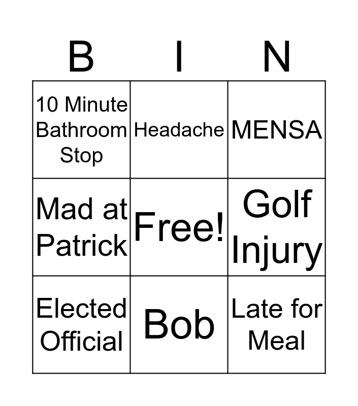 This bingo card has a free space and 8 words: Golf Injury, MENSA, Headache, Elected Official, 10 Minute Bathroom Stop, Late for Meal, Mad at Patrick and Bob.
