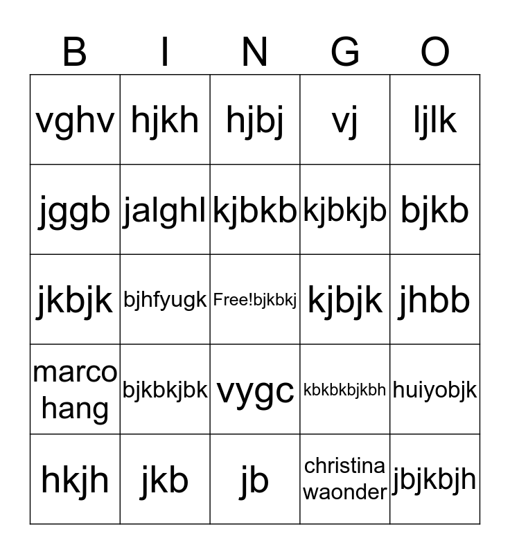 This bingo card has a free space and 34 words: nelly dilemma, christina waonder, beyonce jalf, jhal, marco hang, jalghl, ljlk, hkjh, hjkh, lkhjknkjb, kjbkb, hjbj, bkjbjkbjk, bkjb, kjbjk, bjkb, jkb, jkbjk, bjkbkjbk, kbkbkbjkbh, vygc, u, vghv, jhbb, jb, jbjkbjh, vj, gig, kjbkjb, jggb, jbj, bjhfyugk, huiyobjk and iohjb.