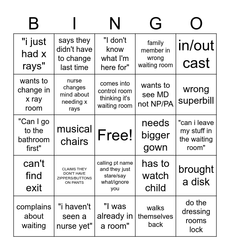 This bingo card has a free space and 24 words: CLAIMS THEY DON'T HAVE ZIPPERS/BUTTONS ON PANTS, "i haven't seen a nurse yet", comes into control room thinking it's waiting room, complains about waiting, in/out cast, "i just had x rays", wants to change in x ray room, says they didn't have to change last time, needs bigger gown, calling pt name and they just stare/say what/ignore you, wants to see MD not NP/PA, "Can I go to the bathroom first", has to watch child, brought a disk, nurse changes mind about needing x rays, walks themselves back, "can i leave my stuff in the waiting room", "I don't know what I'm here for", wrong superbill, musical chairs, do the dressing rooms lock, can't find exit, family member in wrong waiting room and "I was already in a room".