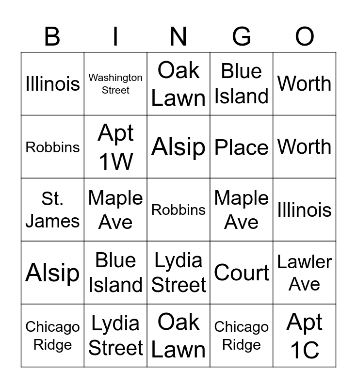 This bingo card has 25 words: Blue Island, Oak Lawn, Alsip, Chicago Ridge, Worth, Illinois, Robbins, Washington Street, Maple Ave, Lydia Street, Place, St. James, Court, Lawler Ave, Apt 1W, Apt 1C, Illinois, Oak Lawn, Worth, Maple Ave, Robbins, Lydia Street, Alsip, Blue Island and Chicago Ridge.