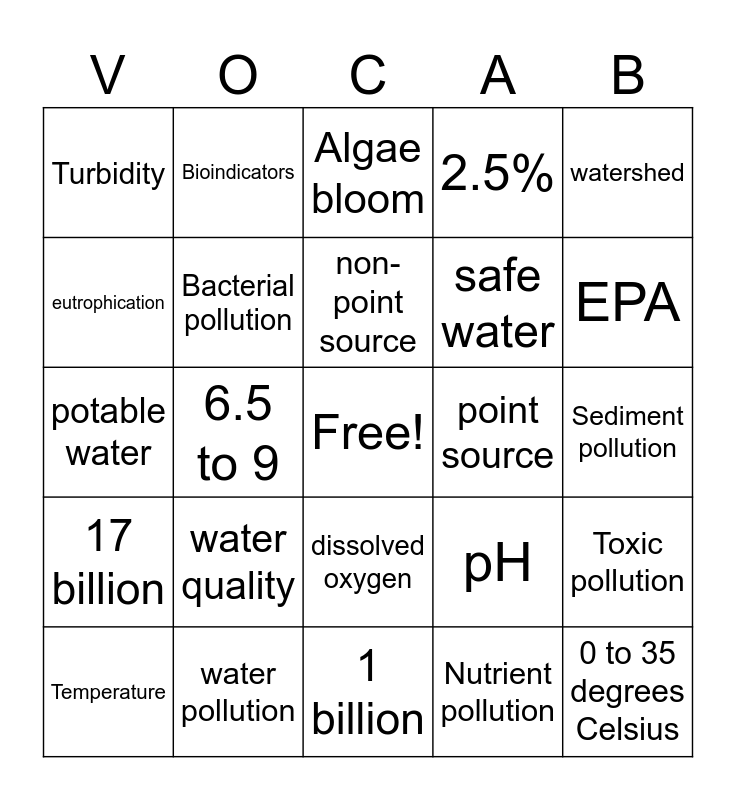 This bingo card has a free space and 24 words: water quality, water pollution, non-point source, Temperature, watershed, Turbidity, eutrophication, Bioindicators, point source, dissolved oxygen, safe water, potable water, pH, Toxic pollution, Bacterial pollution, Nutrient pollution, Sediment pollution, Algae bloom, EPA, 6.5 to 9, 0 to 35 degrees Celsius, 17 billion, 2.5% and 1 billion.