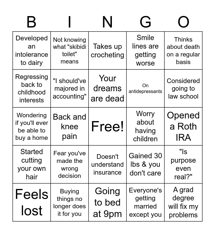 This bingo card has a free space and 24 words: Fear you've made the wrong decision, Buying things no longer does it for you, Your dreams are dead, Feels lost, Thinks about death on a regular basis, Developed an intolerance to dairy, Regressing back to childhood interests, Not knowing what "skibidi toilet" means, Worry about having children, Doesn't understand insurance, On antidepressants, Wondering if you'll ever be able to buy a home, Gained 30 lbs & you don't care, "Is purpose even real?", "I should've majored in accounting", Everyone's getting married except you, Opened a Roth IRA, Takes up crocheting, Considered going to law school, Back and knee pain, A grad degree will fix my problems, Started cutting your own hair, Smile lines are getting worse and Going to bed at 9pm.