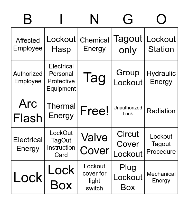 This bingo card has a free space and 24 words: LockOut TagOut Instruction Card, Lock Box, Tag, Lock, Lockout Station, Affected Employee, Authorized Employee, Lockout Hasp, Unauthorized Lock, Valve Cover, Group Lockout, Arc Flash, Circut Cover Lockout, Lockout Tagout Procedure, Electrical Personal Protective Equipment, Plug Lockout Box, Radiation, Chemical Energy, Hydraulic Energy, Thermal Energy, Mechanical Energy, Electrical Energy, Tagout only and Lockout cover for light switch.