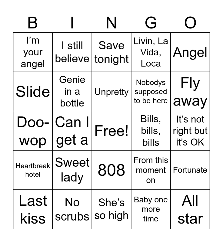 This bingo card has a free space and 59 words: Believe, No scrubs, Angel of mine, Heartbreak hotel, Baby one more time, Kiss me, Genie in a bottle, Every morning, Nobodys supposed to be here, Where my girls that?, Livin, La Vida, Loca, If you had my love, Slide, Have you ever, I want it that way, I’m your angel, All star, Angel, Smooth, Unpretty, Bills, bills, bills, Save tonight, Last kiss, Fortunate, All I have to give, Bailamos, What’s it gonna be?, What’s it like?, Fly away, Someday, That don’t impress me much, Wild wild west, Scar tissue, Heartbreaker, I still believe, The hardest thing, Summer girls, Can I get a, Jumper, Doo-wop, Mambo No. 5, Sweet lady, It’s not right but it’s OK, God must’ve spent a Little more Time on you, Lullaby, Anywhere, Tell me it’s real, Back 2 good, 808, She’s so high, She’s all I ever had, Miami, Hands, Who dat, Please remember me, From this moment on, Love like this, You and Trippin.
