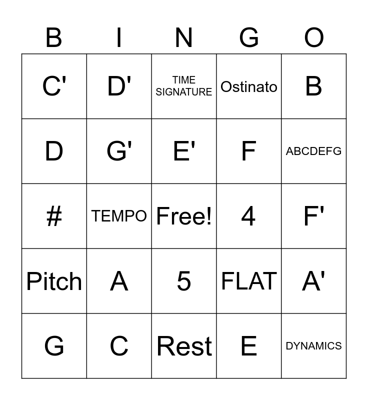 This bingo card has a free space and 24 words: A, C, E', G, B, C', D, D', 4, 5, F, #, FLAT, A', G', E, F', TIME SIGNATURE, ABCDEFG, TEMPO, DYNAMICS, Pitch, Ostinato and Rest.