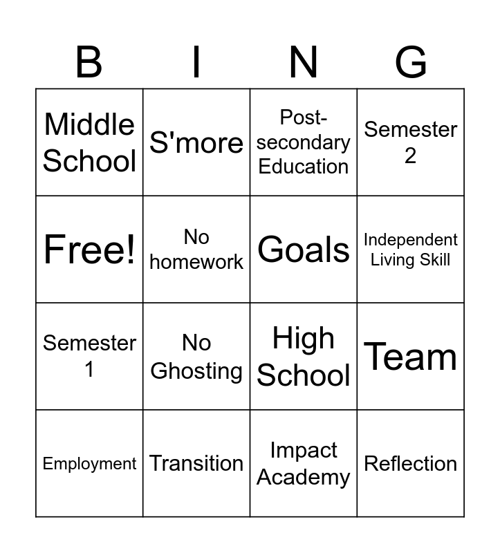 This bingo card has 16 words: Transition, Team, Post-secondary Education, Middle School, Semester 1, S'more, High School, Impact Academy, Free!, No homework, Employment, Semester 2, No Ghosting, Independent Living Skill, Goals and Reflection.