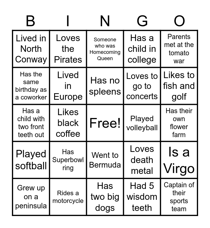 This bingo card has a free space and 24 words: Has Superbowl ring, Rides a motorcycle, Has no spleens, Grew up on a peninsula, Parents met at the tomato war, Lived in North Conway, Has the same birthday as a coworker, Loves the Pirates, Played volleyball, Went to Bermuda, Loves to go to concerts, Has a child with two front teeth out, Loves death metal, Is a Virgo, Lived in Europe, Had 5 wisdom teeth, Has their own flower farm, Someone who was Homecoming Queen, Likes to fish and golf, Likes black coffee, Captain of their sports team, Played softball, Has a child in college and Has two big dogs.