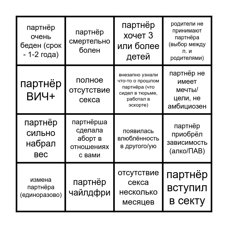 This bingo card has 16 words: измена партнёра (единоразово), партнёр чайлдфри, партнёр хочет 3 или более детей, родители не принимают партнёра (выбор между п. и родителями), партнёр ВИЧ+, партнёр смертельно болен, появилась влюблённость в другого/ую, партнёр приобрёл зависимость (алко/ПАВ), партнёр очень беден (срок - 1-2 года), полное отсутствие секса, отсутствие секса несколько месяцев, партнёр не имеет мечты/ цели, не амбициозен, партнёр сильно набрал вес, партнёрша сделала аборт в отношениях с вами, внезапно узнали что-то о прошлом партнёра (что сидел в тюрьме, работал в эскорте) and партнёр вступил в секту.