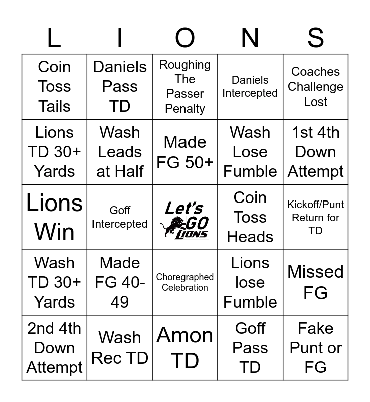 This bingo card has a free space and 37 words: Celeb sighting, 2pt Conversion Attempt, Lions Leads at Half, Wash Leads at Half, Missed FG, Made FG 40-49, Made FG 50+, Coaches Challenge Won, Coaches Challenge Lost, QB CrUMBLE!!, Goff Intercepted, Daniels Intercepted, Fake Punt or FG, Kickoff/Punt Return for TD, Lions TD 30+ Yards, Wash TD 30+ Yards, Face Painted Fan, Roughing The Passer Penalty, Choregraphed Celebration, Coin Toss Heads, Coin Toss Tails, 1st 4th Down Attempt, 2nd 4th Down Attempt, Amon TD, Daniels Run TD, Goff Pass TD, Daniels Pass TD, Knuckles TD, Sonic TD, Laporta TD, Wash Run TD, Wash Rec TD, Lions Win, Wash win (boooo), Lions lose Fumble, Wash Lose Fumble and Jamo TD.