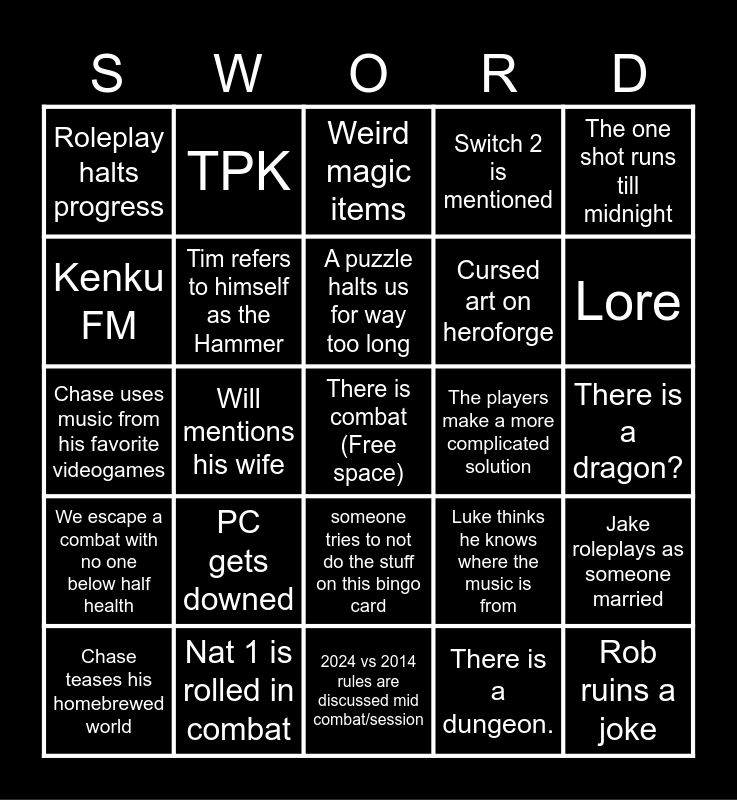 This bingo card has a free space and 24 words: PC gets downed, Nat 1 is rolled in combat, A puzzle halts us for way too long, Chase teases his homebrewed world, The one shot runs till midnight, Roleplay halts progress, Kenku FM, TPK, The players make a more complicated solution, someone tries to not do the stuff on this bingo card, Cursed art on heroforge, Chase uses music from his favorite videogames, Luke thinks he knows where the music is from, Jake roleplays as someone married, Tim refers to himself as the Hammer, There is a dungeon., There is a dragon?, Weird magic items, Lore, Will mentions his wife, Rob ruins a joke, We escape a combat with no one below half health, Switch 2 is mentioned and 2024 vs 2014 rules are discussed mid combat/session.