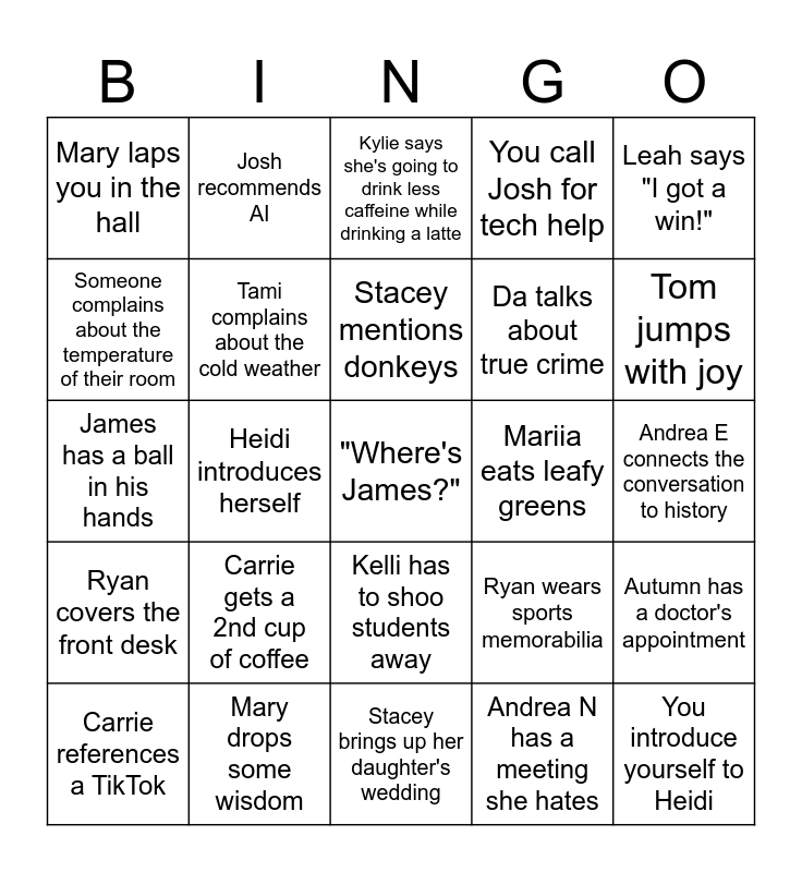 This bingo card has a free space and 24 words: Carrie gets a 2nd cup of coffee, Mary drops some wisdom, Stacey mentions donkeys, Carrie references a TikTok, Leah says "I got a win!", Mary laps you in the hall, Someone complains about the temperature of their room, Josh recommends AI, Mariia eats leafy greens, Kelli has to shoo students away, Da talks about true crime, James has a ball in his hands, Ryan wears sports memorabilia, Autumn has a doctor's appointment, Tami complains about the cold weather, Andrea N has a meeting she hates, Andrea E connects the conversation to history, Kylie says she's going to drink less caffeine while drinking a latte, Tom jumps with joy, Heidi introduces herself, You introduce yourself to Heidi, Ryan covers the front desk, You call Josh for tech help and Stacey brings up her daughter's wedding.