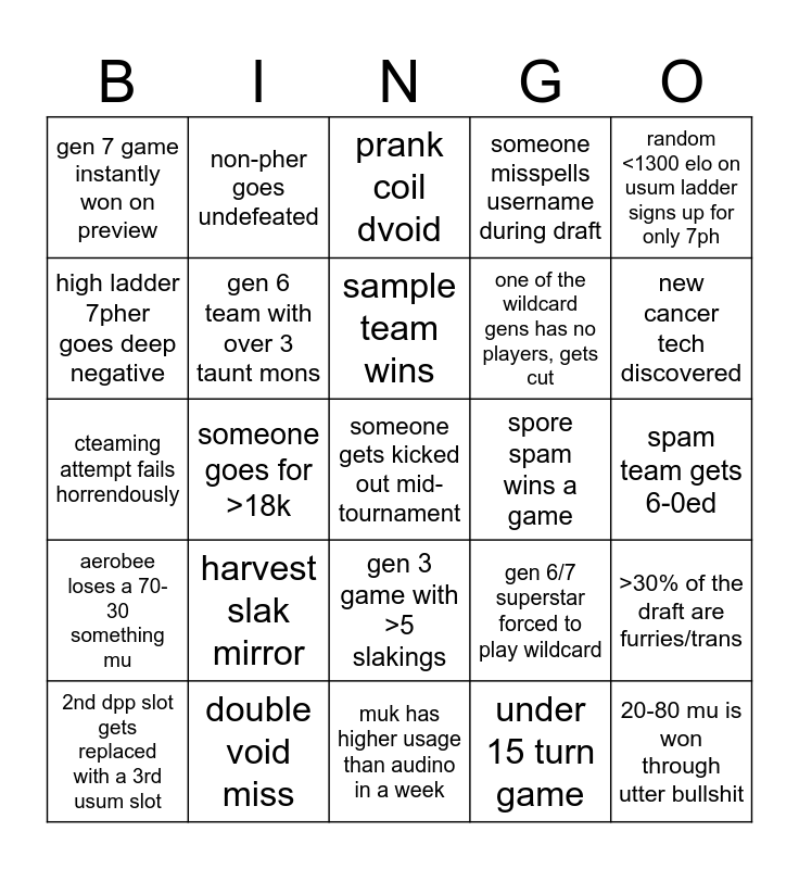 This bingo card has a free space and 24 words: harvest slak mirror, double void miss, sample team wins, 2nd dpp slot gets replaced with a 3rd usum slot, random <1300 elo on usum ladder signs up for only 7ph, gen 7 game instantly won on preview, high ladder 7pher goes deep negative, non-pher goes undefeated, spore spam wins a game, gen 3 game with >5 slakings, one of the wildcard gens has no players, gets cut, cteaming attempt fails horrendously, gen 6/7 superstar forced to play wildcard, >30% of the draft are furries/trans, gen 6 team with over 3 taunt mons, under 15 turn game, spam team gets 6-0ed, prank coil dvoid, new cancer tech discovered, someone goes for >18k, 20-80 mu is won through utter bullshit, aerobee loses a 70-30 something mu, someone misspells username during draft and muk has higher usage than audino in a week.